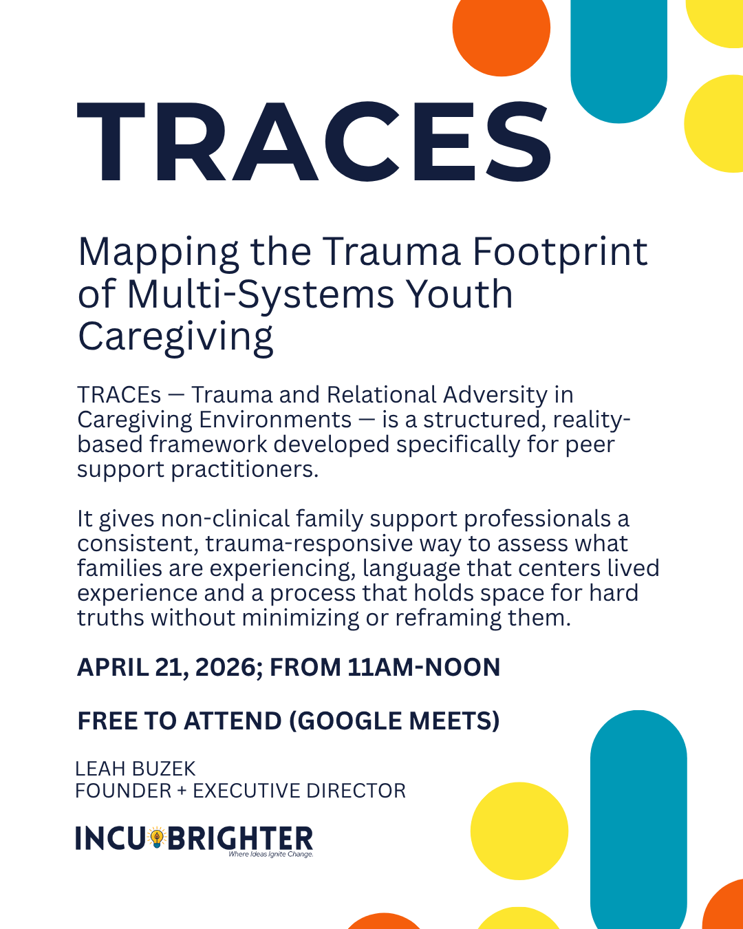 TRACEs—Trauma and Relational Adversity in Caregiving Environments— is IncuBrighter’s assessment framework designed to help professionals understand the full ecological context surrounding youth and families who interact with multiple systems.
